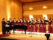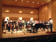 日本と韓国が、それぞれ合唱団をお迎えしてコンサートを行う。 言葉にしてしまうと、単純な、でも恐ろしくエネルギーのいるプロジェクトが、小柴信之が指揮する2つの合唱団(アンサンブルあしたば、合唱団「うたおに」)によって行われました。 この日を迎えるまでの膨大なエネルギーを尻目に、当日は台風23号が直撃! 大雨・洪水・暴風雨警報の発令される中、やり直しのできないプロジェクトは決行されたのでした。有料入場者数、78名! 大袈裟でなく、命がけで聴きに来て下さったお客様には、感謝するばかりでした。 ●10月19日 ○10:00 出迎え部隊出発 津米津の三交バス営業所を出発し、バスは小牧空港に12:40着の飛行機を出迎えます。 日本側ツアーコンダクターは、うたおにスーちゃん。普段のお仕事も似たようなことをされているだけあり、テキパキと段取りを進めます。 皆さんをバスに乗せ、まず向かった先は榊原温泉! ○17:00 榊原温泉 日本の温泉を堪能してもらおうという趣向です。大騒ぎしながらお風呂に入り、遅れ気味のスケジュールを挽回すべく、チェックインを後回しにし、そのままレセプション会場の高田青少年会館に向かいます。 ○19:00 レセプション 会場は、約100畳の大広間。ここに10個の卓と中央に料理が並べられます。畳だけれど立食形式という、世界初?のパーティ形式となりました。 レセプションを盛り上げたのは、津高虎太鼓「華之津会」の皆さん。韓国の方々に日本の伝統芸能をお見せしたいという我々の希望を快く引き受けていただきました。約20分の演奏でしたが、音楽は万国共通ということを実感した瞬間でした。 ●10月20日 ○8:00 伊勢志摩観光のはず? 津のホテルを出発し、観光のため伊勢・志摩へ。しかし、台風直撃の中、真珠島とホテルのバイキングのみで早々に引き上げます。 ○15:00 韓国側リハーサル 江南区立合唱団のリハーサルが始まります。ここから2時間、フルヴォイスで歌いっぱなし!あまりのタフネスに全員驚嘆です。後でパワーの源を聞いたら「キムチー!」との答え。コリアンパワー恐るべし。 ○17:00 日本側リハーサル 日本側リハーサル開始。その後、日本韓国混じってのアンコール練習。初見に近いのに韓国側の赤トンボはほぼ完璧。日本側は大丈夫かな? ○18:30 いよいよ演奏会 演奏会開始。台風が最接近と重なり、客席は少なめ。日本側演奏者も客席で聞かせてもらいました。 しかし、お客様の反応は素晴らしく、暖かい拍手をたくさんいただきました。この時、市内は停電はあるわ、信号が消えているわと、大変な状況だったそうです。命がけで会場にお越しいただいた皆さん。本当にありがとうございました。 ○21:15 打ち上げ 台風が去り、風が残るものの、雨は既に止んでいました。最後まで心配しましたが、予定どおり打ち上げ決行! 打ち合わせも無かったのに、日本側・韓国側が、お土産を持参。それぞれがお土産を交換しあいました。 最後は、バスまでお見送り。台風一過の津の町で、大盛り上がりでバスを囲み「蛍の光」を歌う様はさぞかし異様な集団だったでしょう。 ●10月21日 ○8:30 御見送り 前日までの天気が嘘のように晴れ渡る中、江南区立合唱団の皆さんは、観光地、奈良へ向かわれました。