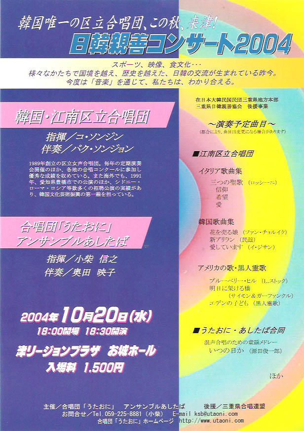 | 日韓親善コンサート2004 2004年10月20日(水) 津リージョンプラザお城ホール 18時30分 開演 |