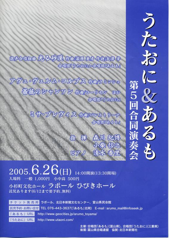 うたおに&あるも 第5回合同演奏会 2005年6月26日(日) 14:00開演 小杉町文化ホール ラポール ひびきホール |
