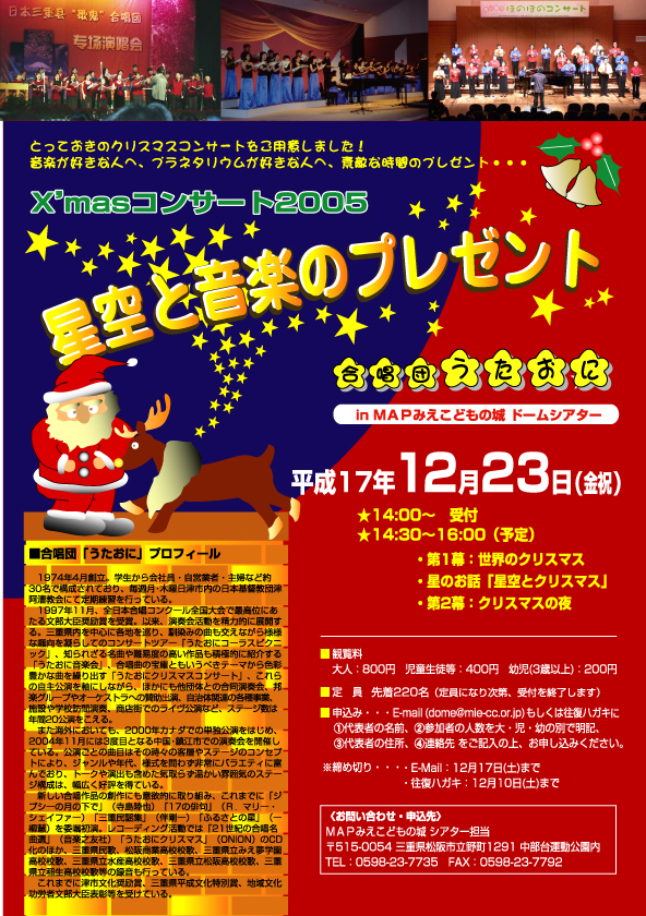 みえこどもの城プレゼンツ X’mas コンサート2005 〜星空と音楽のプレゼント〜 2005年12月23日(祝) 14:30 開演 松阪みえこどもの城ドーム |