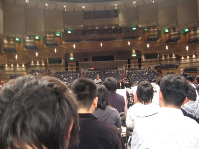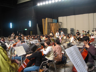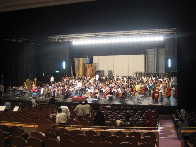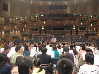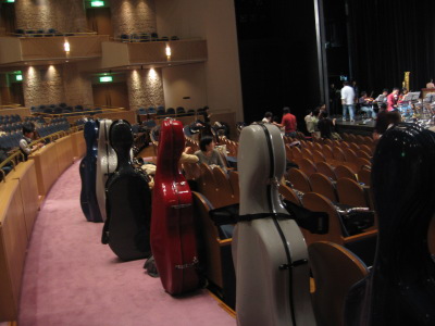 2006年4月29日 合同練習の風景 練習会場は三重県文化会館中ホールです 練習前、大谷先生のお言葉 指揮者まで遠〜い 休憩中 コントラバスだけでもこんなに こんなのも乱打されます |