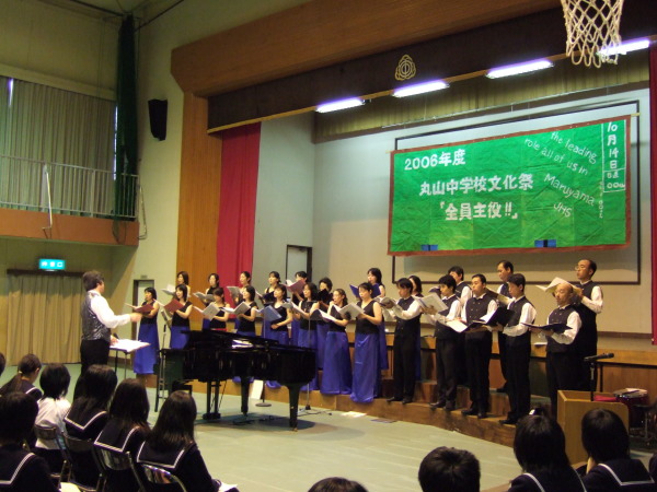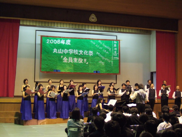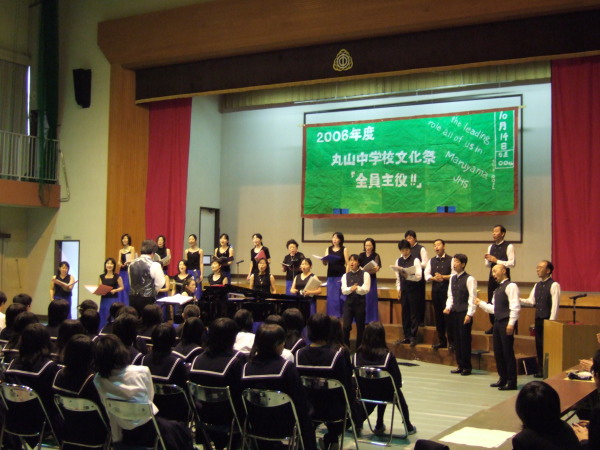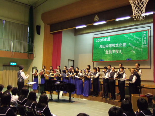 丸山中学校は、伊賀市の中学校。 旧上野市の南部。 三重県の地理に明るい方でしたら、近鉄 伊賀神戸駅で 伊賀線に乗り換え、3つ目の駅で下車といえば 見当がつくでしょうか。 心配された迷子もなく、全員が無事、中学校に到着し、 予定どおりに13:00から演奏が始まりました。 さて、演奏は、まずゴスペルシリーズから。 いきなり手拍子つきからの曲からでしたが、 生徒さんは恥ずかしかったのかな? 3曲目のHail Holy Queenでは、ソロのために ワイヤレスマイクを用意。カラオケのようにマイクを 共有するソリスト達は病みつきになったかも。 その後、日本の歌シリーズ、外国の歌シリーズ、 三重に縁の歌シリーズ、平和の歌シリーズ、宮崎アニメシリーズと 続きます。 Magic songs では、あまりの強烈(?)さに、 生徒さんたちはどうしていいか分からなかった様子。 好まれていた曲は、ハナミズキや、旅立ちの日になどでしょうか。 最後は、生徒会の方がアンコールをかけてくださいました。 きっと、気を使ってくれたんでしょうね (^-^) どうも、ありがとう! |