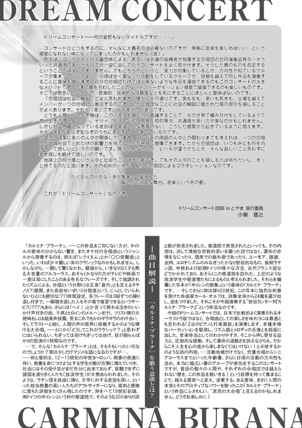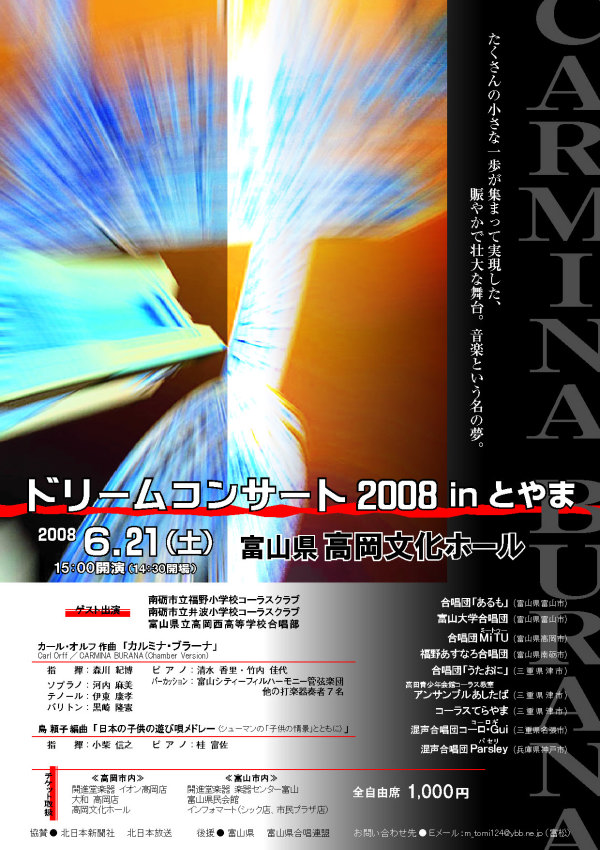 ドリームコンサート2008 in とやま 2008年6月21日(土) 15:00開演 富山県 高岡文化ホール 後援 富山県 富山県合唱連盟 協賛 北日本新聞社 北日本放送 たくさんの小さな一歩が集まって実現した、 賑やかで壮大な舞台。音楽という名の夢。 |