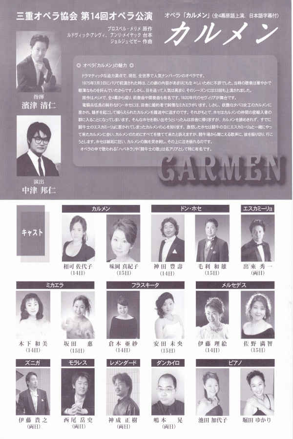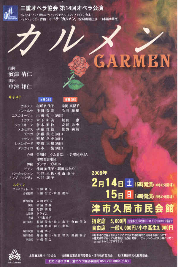 三重オペラ協会 第14回オペラ公演 プロスペル・メリメ原作/ルドヴィック・アレヴィ、アンリ・メイヤック台本 ジョルジュ・ビゼー作曲 カ ル メ ン (全4幕原語上演、日本語字幕付) 2009年2月14日(土) 15時開演 2009年2月15日(日) 14時開演 津市久居市民会館 |
