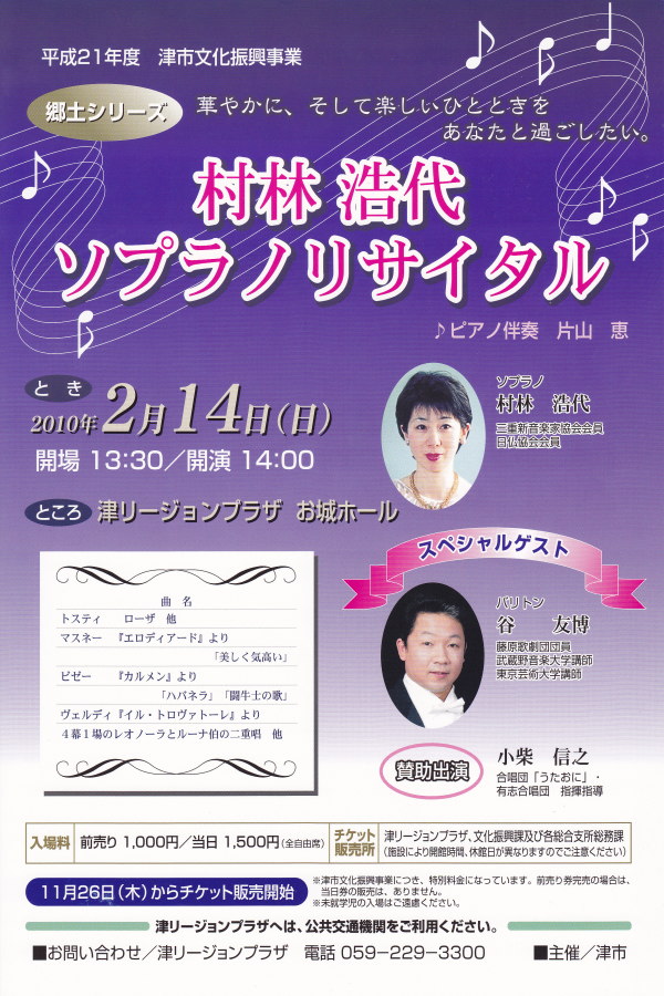 平成21年度 津市文化振興事業 郷土シリーズ 村林浩代 ソプラノリサイタル 2010年2月14日(日) 14:00開演 津リージョンプラザ お城ホール |