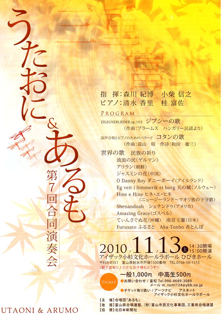 プログラム ○ZIGEUNERLIEDER,op.103 「ジプシーの歌」 (作曲:ブラームス ハンガリー民謡より)(ジプシー) ○混声合唱とピアノのためのバラード 「コタンの歌」 (作曲:湯山 昭 作詩:和田 徹三)(アイヌ) ○世界の歌 民族の祈り 流浪の民 (ジプシー) アリラン (朝鮮) ジャスミンの花 (中国) O Danny Boy ダニーボーイ (アイルランド) Eg veit i himmerik ei borg 天の城 (ノルウェー) Hine e Hine ヒネ・エ・ヒネ (ニュージーランド〜マオリ族の子守歌) Shenandoah シェナンドゥ (アメリカ) Amazing Grace (ゴスペル) てぃんさぐぬ花 (沖縄) 南京玉簾 (日本) (アンコール) Furusato Aka-tonbo |