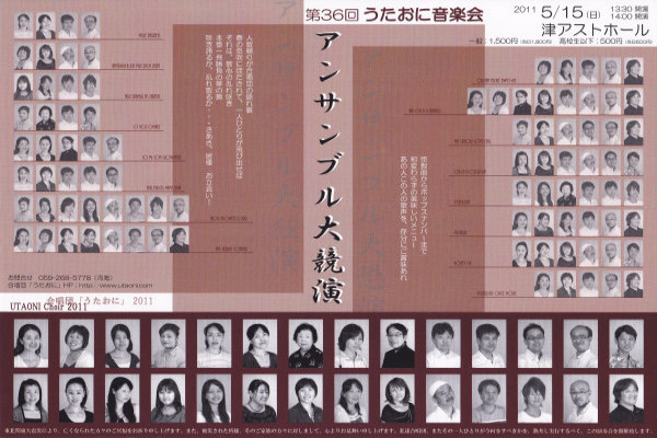 第36回うたおに音楽会 アンサンブル大競演 大狂演 大恐演 2011年5月15日(日) 13:30開場 14:00開演 津アストホール 一般 1500円(当日1800円) 高校生以下500円(当日600円) チラシはこちら チラシの拡大版はこちら |