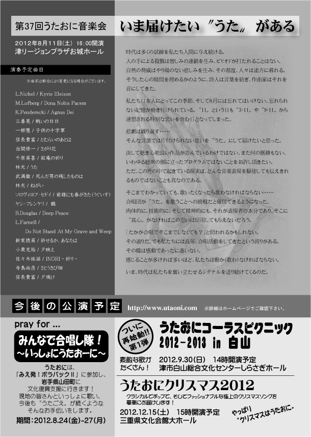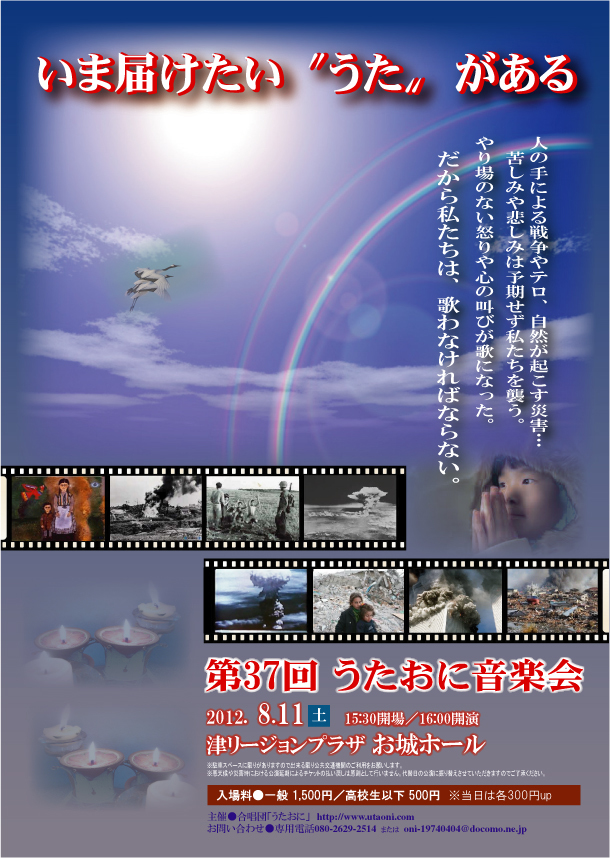 第37回うたおに音楽会 いま届けたい”うた”がある 2012年8月11日(土)16:00開演 津リージョンプラザお城ホール 入場料 一般 1500円、高校生以下 500円 (当日券は、各300円増し) |