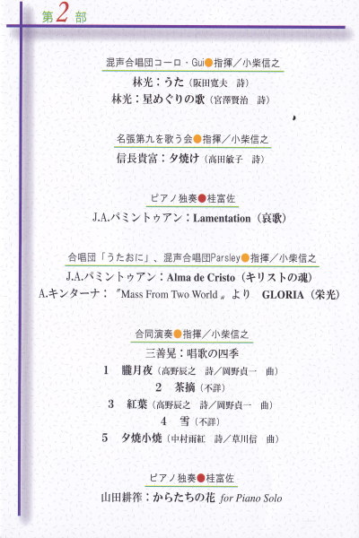 この日は、合唱団「うたおに」のピアニスト 桂富佐さんのピアノコンサート。 普段、ソロ活動よりもアンサンブル活動を 主に行う桂さんらしく、 「ピアノコンサート」の表題にも関わらず、 ソロあり、デュエットあり、トリオあり、合唱あり。 総勢80名余が参加するコンサートになりました。 また、この日は、桂さんの50歳を祝うBirthday Memory コンサート。 アンコールでは、ハッピィバースディーの歌声とともに、 花束とケーキのサプライズも。 お客様からも、舞台からも拍手を受ける桂さんは、 とても幸せそうでした。 これからもどうぞよろしく! |