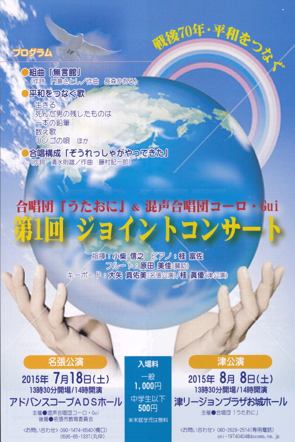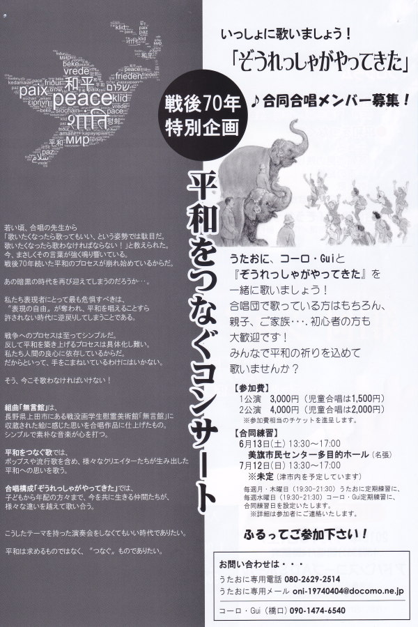 混声合唱団コーロ・Guiさんと、 合唱団「うたおに」は、ともに小柴信之が指揮をする合唱団。 随分、長い間、一緒に演奏していますが、 正式なジョイントコンサートは、ナント、初めて。 それぞれの地元、名張と、津で公演することとなりましたが、 まずは名張市から。 戦後70周年を記念し、平和を祈る曲を集めたステージは、 意図した訳ではないのに、タイムリーな選曲になってしまいました。 演奏と同時に、平和のことを考える貴重な体験になりました。 そして、この日のメインは「ぞうれっしゃがやってきた」 子供たちが平和を願う歌を聞くと、歳のせいか、涙腺が緩みそうに。 必死でこらえて最後まで歌い切りました。 また、津でもよろしくね。 |