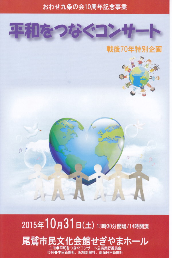おわせ九条の会10周年記念事業 平和をつなぐコンサート 2015年10月31日(土) 14時開演 尾鷲市民文化会館せぎやまホール 主催 平和をつなぐコンサート公演実行委員会 後援 中日新聞社、紀勢新聞社、南海日日新聞社 |