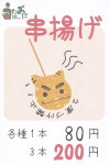 MENU 豚串 うずら玉子 エビ団子 串揚げ 一本80円 、 三本なら200円 (裏メニュー) 唐揚げ メンチカツ |