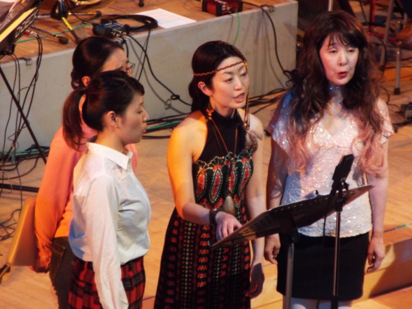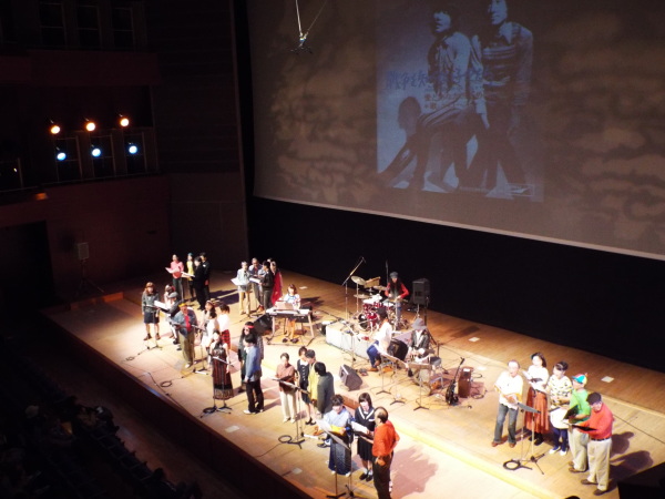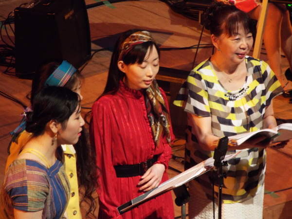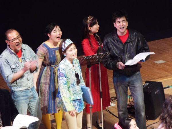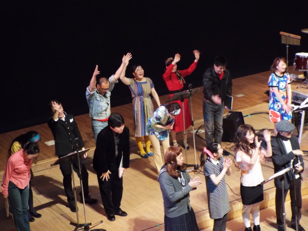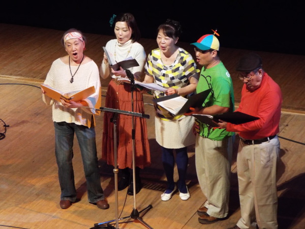 1か月前の神戸公演に続き、 混声合唱団Parsleyさんとのジョイントコンサート。 第1ステージは、北欧の合唱曲。 第2ステージは、南米の合唱曲。 ごく普通の合唱のコンサートの形式ですが、 たったひとつ違うのは、舞台と客席の間の 大きく沈み込んだスペース。 オーケストラピットにあたる部分が、4m近く沈んでいますが、 この謎は、後半、解き明かされます。 休憩中にせり上がったスペースからは、バンドと 8本のスタンドマイクが登場。 後半は、前半とは同じ合唱団とは思えない 70年代ポップスのステージです。 メンバーも70年代をイメージした思い思いの衣装を身に着けて登場。 どうぞ、このページの最後までご覧いただき、 メンバーの扮装ぶりをご覧ください。 |