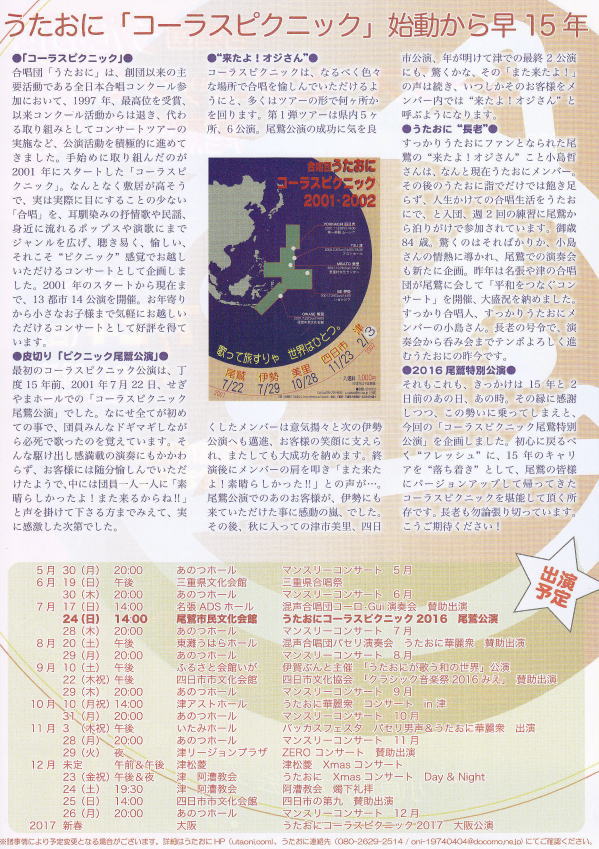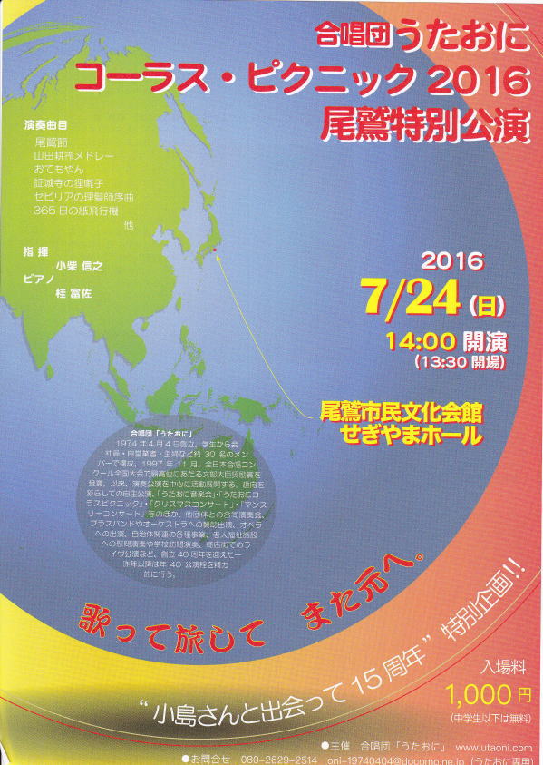 うたおにコーラスピクニック2016 尾鷲特別公演 2016年7月24日(日) 14時開演 尾鷲市文化会館 せぎやまホール 入場料 1,000円(中学生以下無料) |