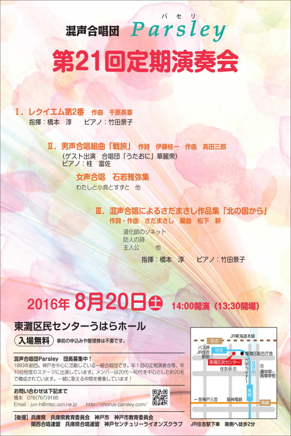 混声合唱団Parsley 第21回定期演奏会 2016年8月20日(土)14時00分開演 東灘区民センター うはらホール |
