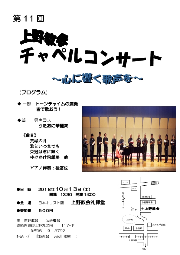 | 第11回 上野教会チャペルコンサート 2018年10月13日(土)14時00分開演 上野教会礼拝堂 |
