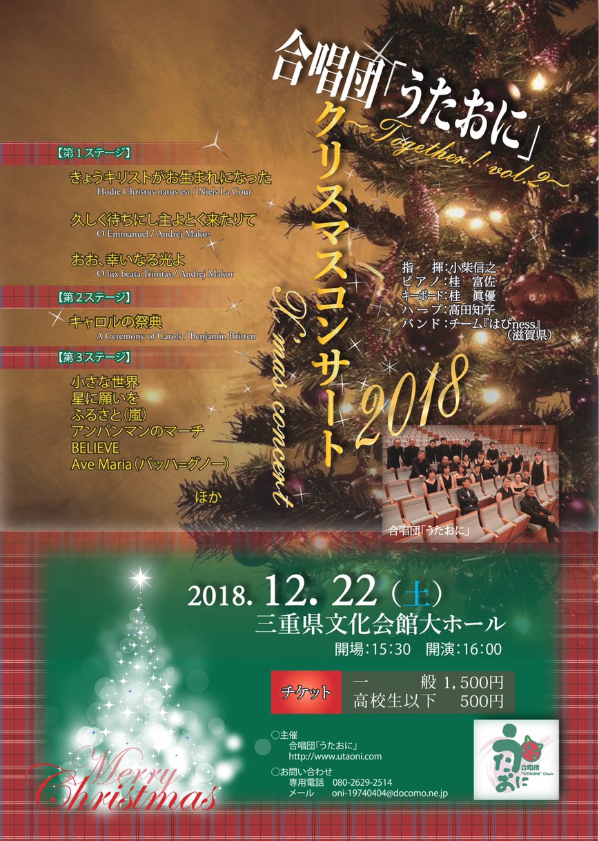 うたおに クリスマスコンサート2018 Togeter Vol.2 2018年12月22日(土) 16:00~ 三重県文化会館大ホール 一般1500円 高校生以下500円 |