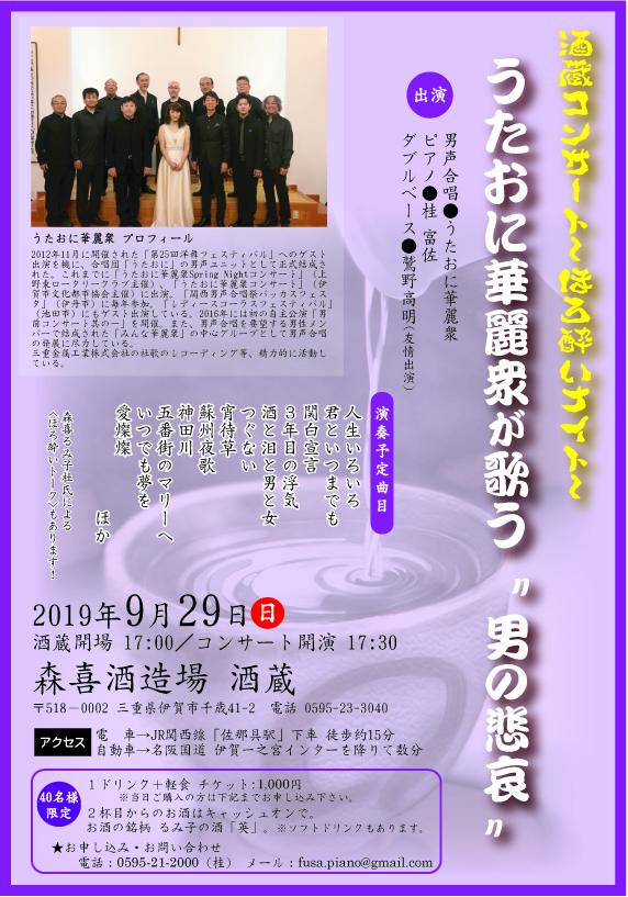 うたおに華麗衆 酒蔵コンサート~ほろ酔いナイト~ 2019年9月29日(日) 17:30~ 森喜酒造場酒蔵 |