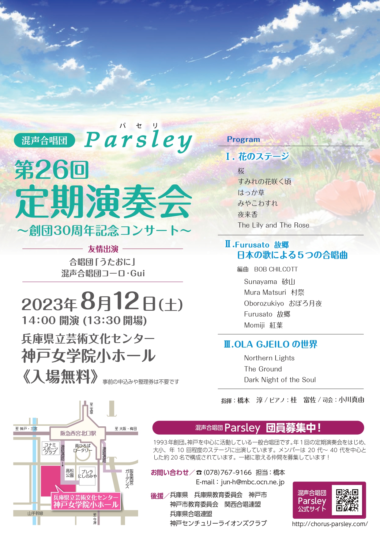混声合唱団Parsley 第26回定期演奏会 2023年8月12日(土) 兵庫県立芸術文化センター 神戸女学院小ホール |